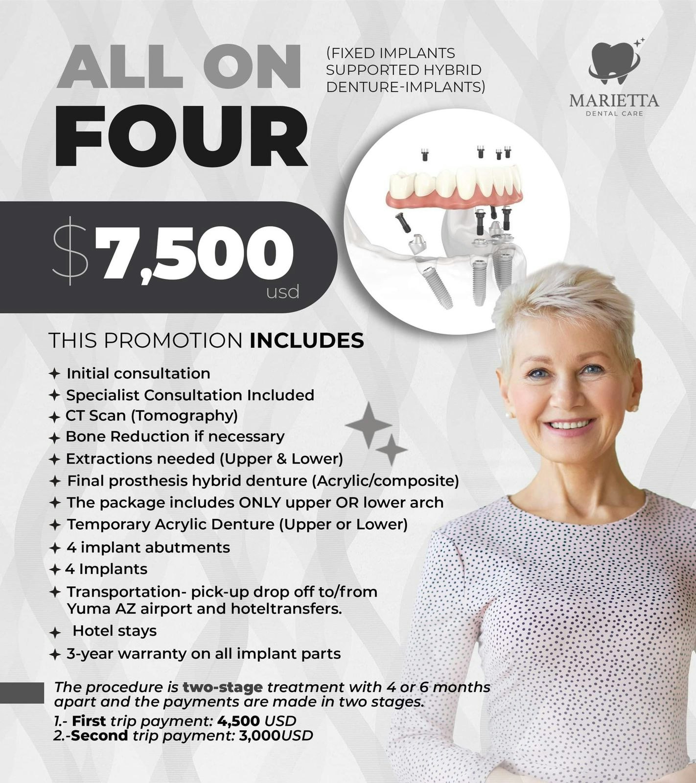 Marietta Dental Care offers All-on-4 implants in Los Algodones and Tijuana, Mexico, for only $7,500 - $13,500/ arch